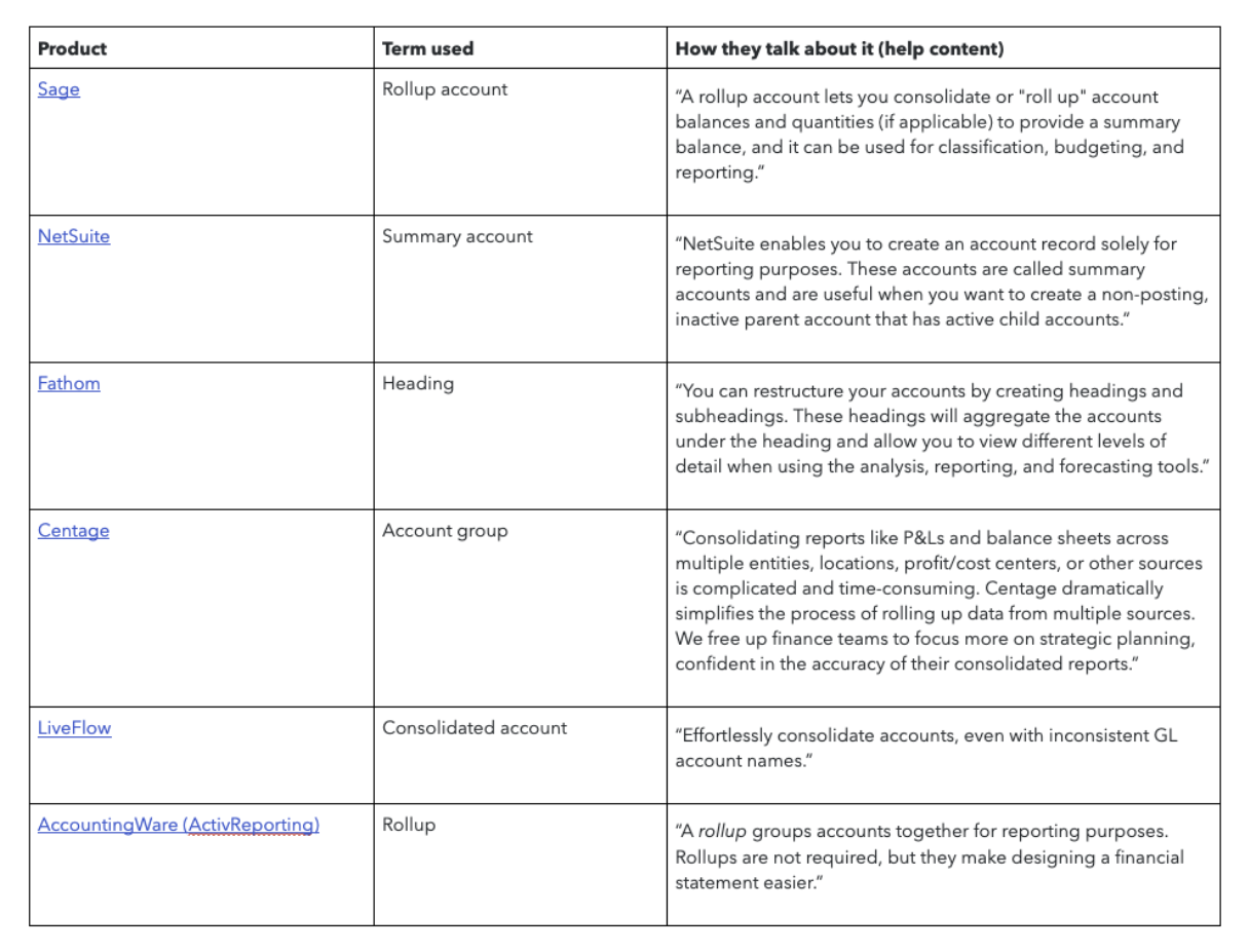 Competitive analysis: I did a content audit of other products to find out what terms were being used across the industry. I discovered there was no standard term—each competitor had their own words for this concept.