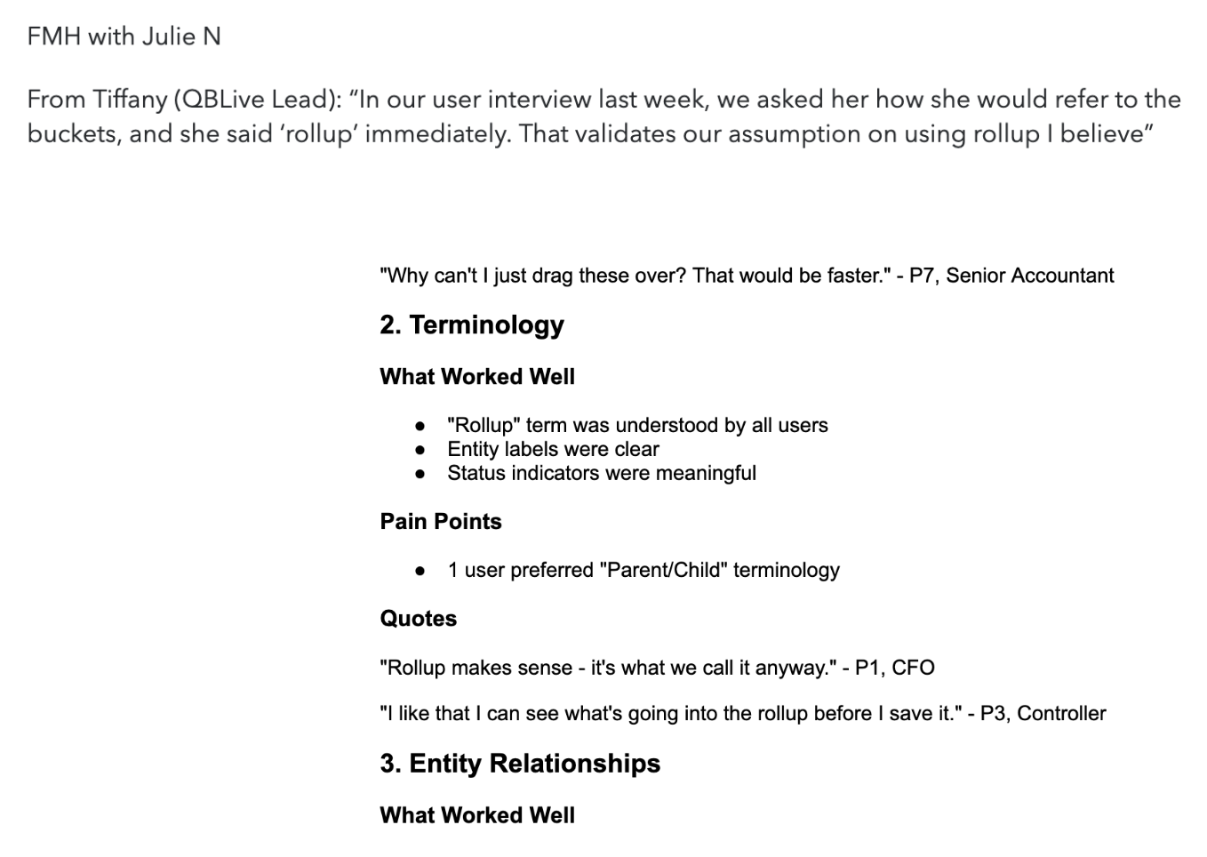 The new “rollup” feature was included in the alpha launch of Intuit’s new enterprise accounting product. We tracked customer feedback, and it revealed no issues with the terminology, confirming the effectiveness of our naming decision.